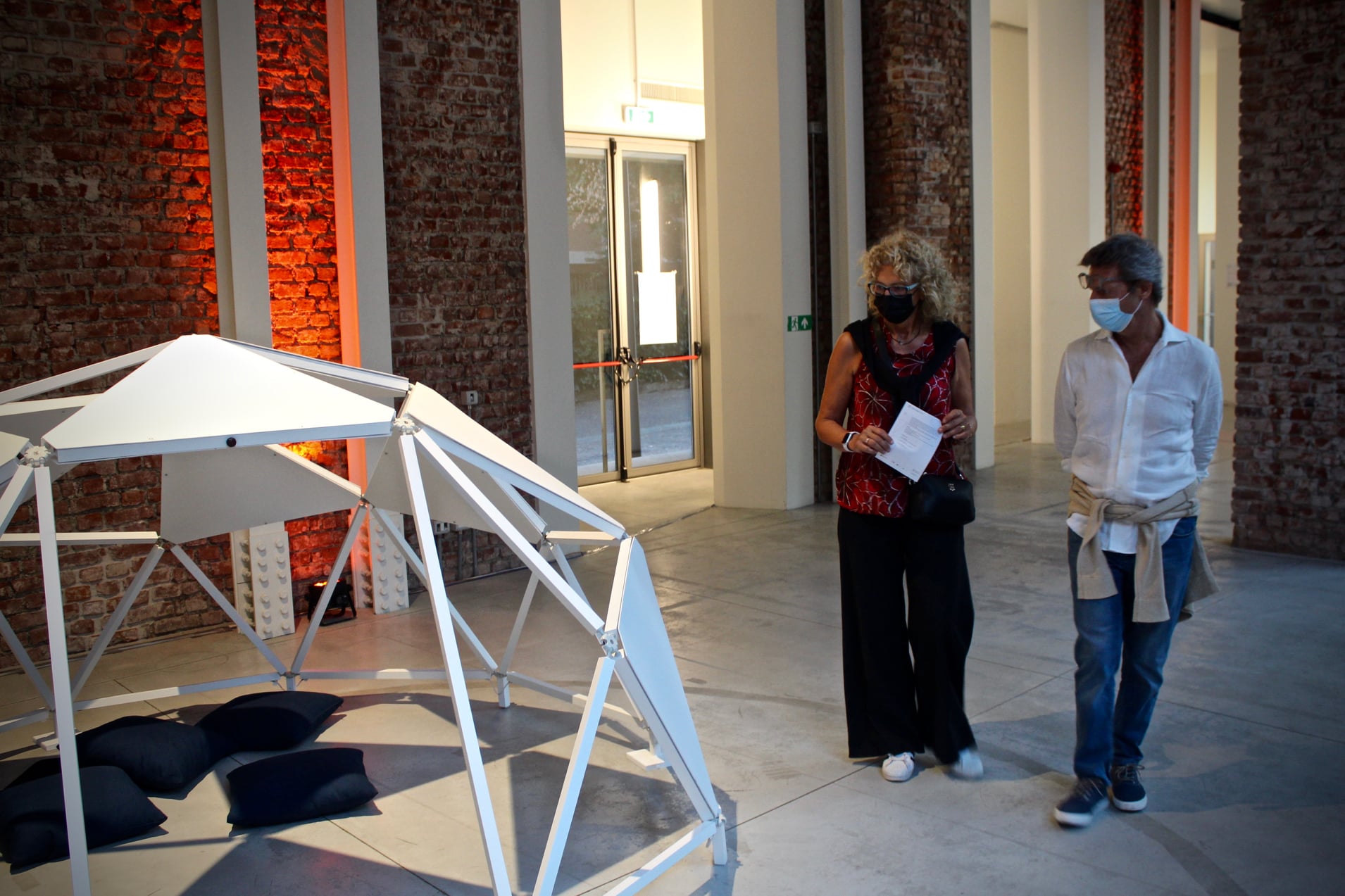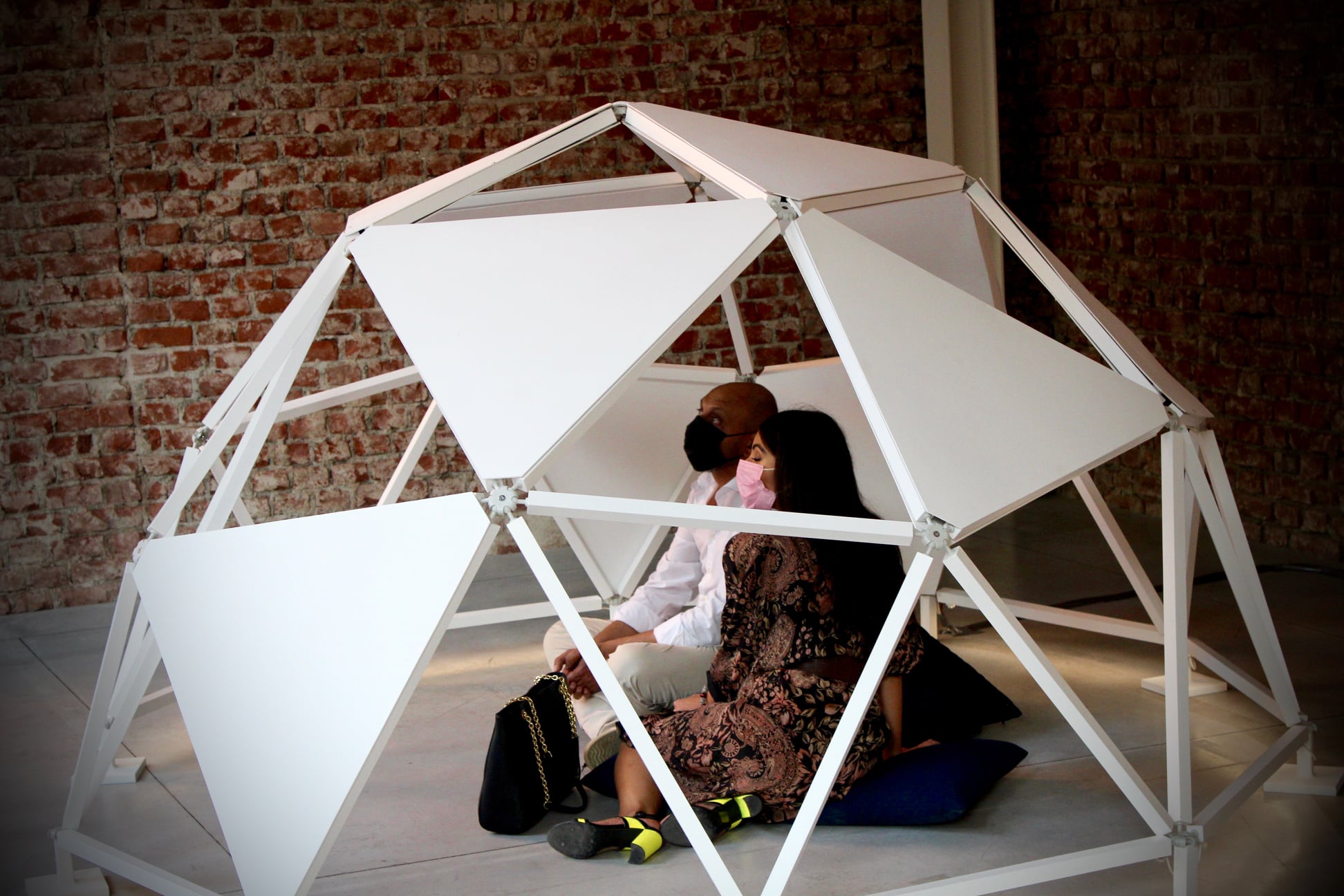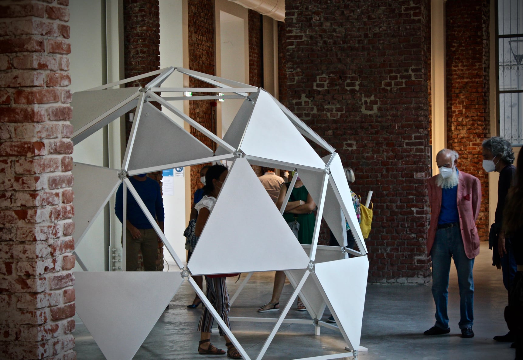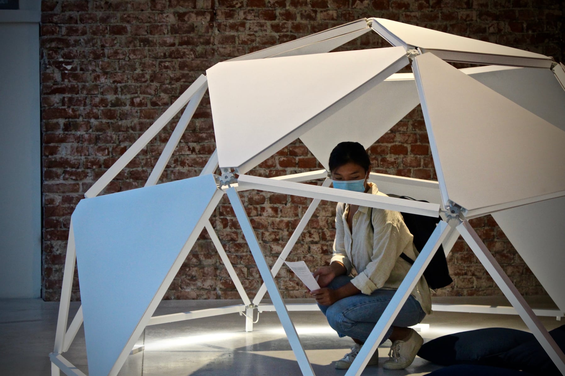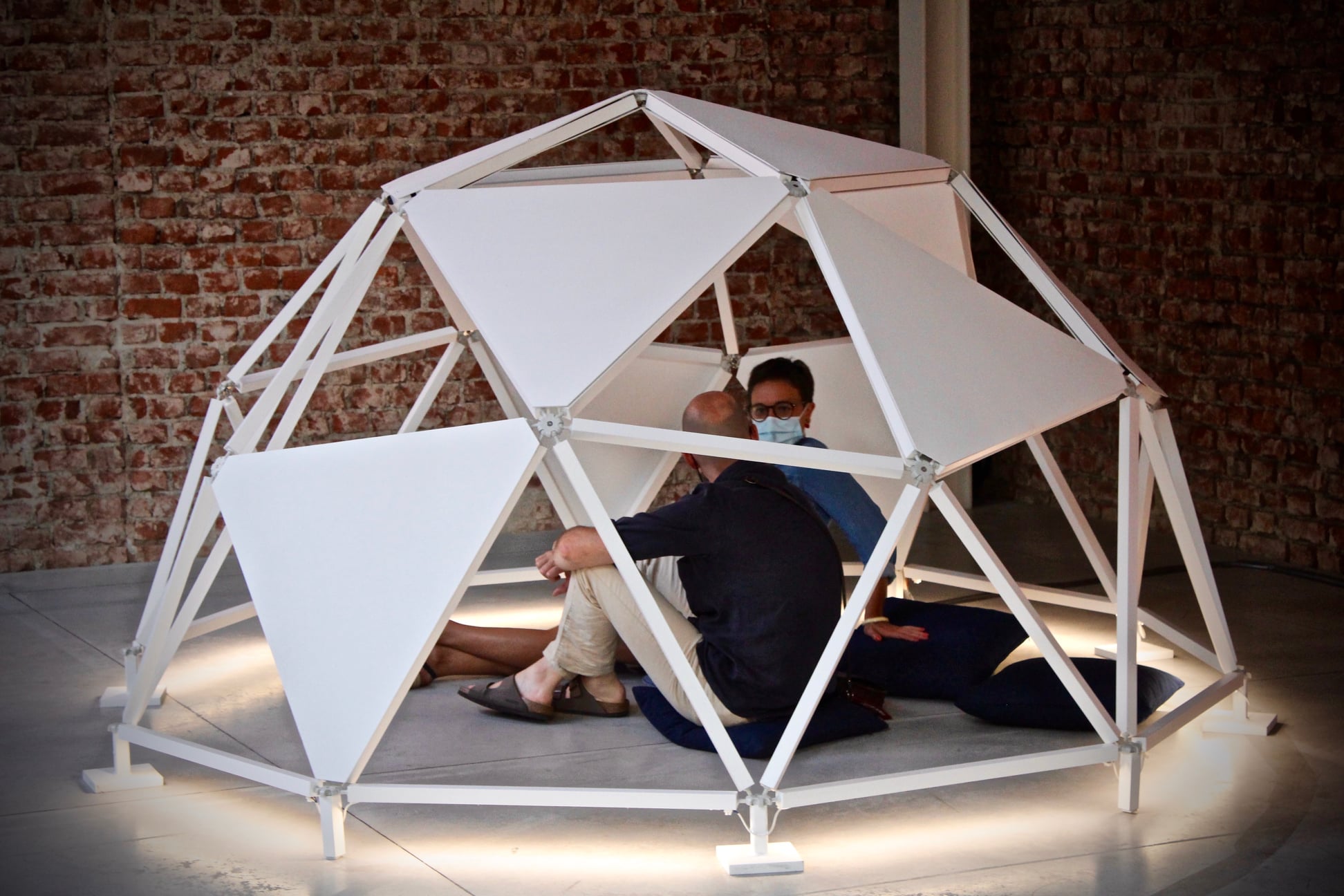The work consists of three modular geodesic domes that metaphorically trace the three phases of the pandemic; in a process of synthesis and sound dramaturgy, the two artists question the need for a society forced to redesign time and space, establishing new perimeters of safety. The sound spaces equipped with a multi-channel sound system and sensors, which detect the entry of visitors and determine the acousmatic textures and glitches diffused inside the other domes, triggering a process of contagion between the domes and their own inhabitants. Visitors individually join the sound spaces. The entrance and the type of movements of the user determines sound mutations inside their own area of action. Through a specific algorithm, the sensors react to the movements of the users in the two open domes. Over time the domes become more and more "intolerant" to the human presence, so an accumulation process made of glitches, noisy textures, led flickering, are transferred to the third closed dome which filters the process through the low frequencies.