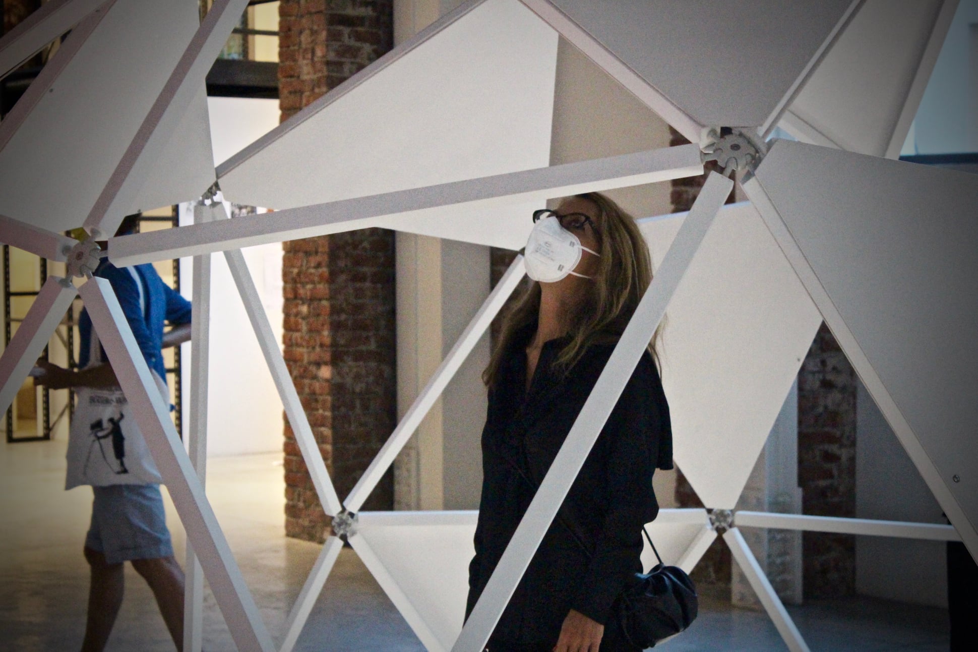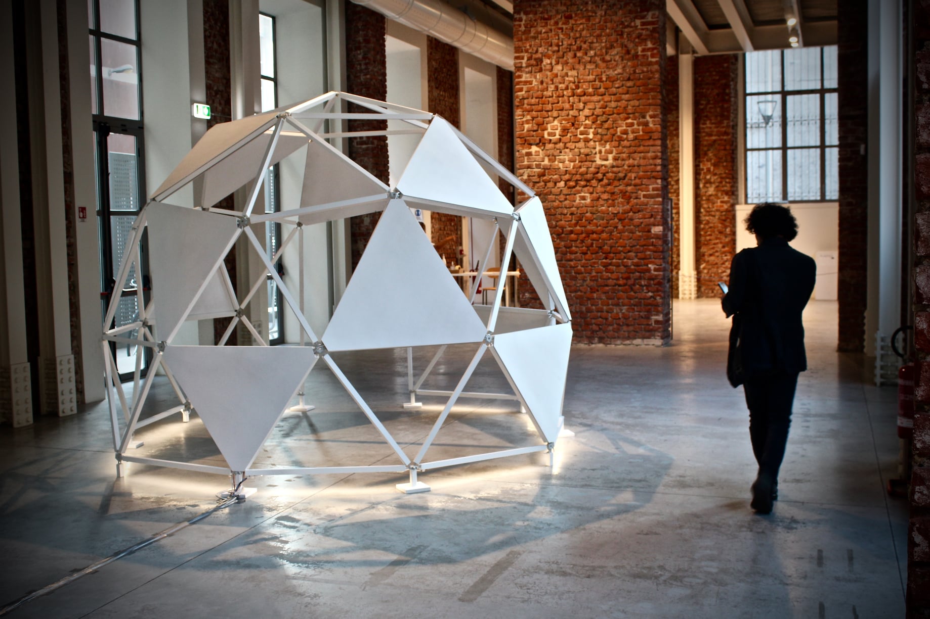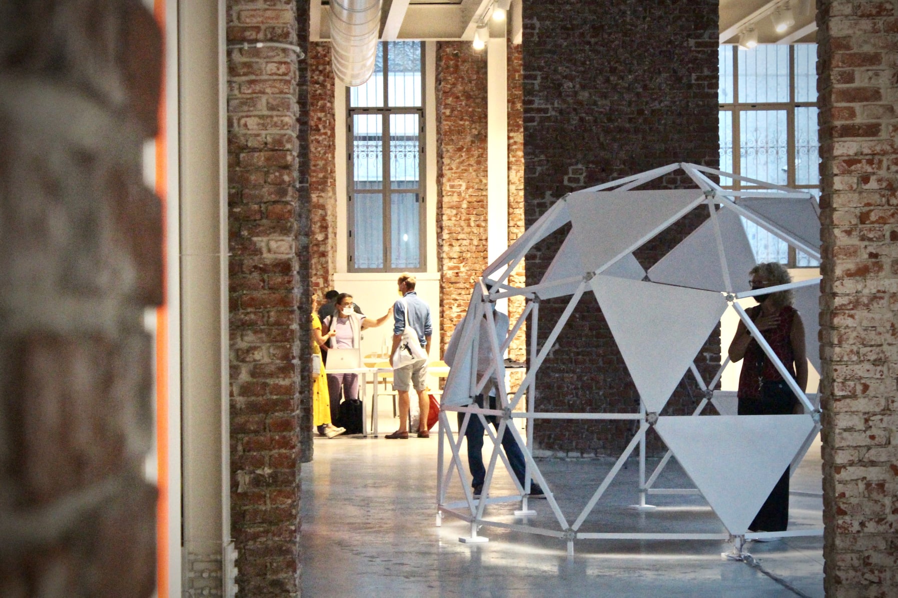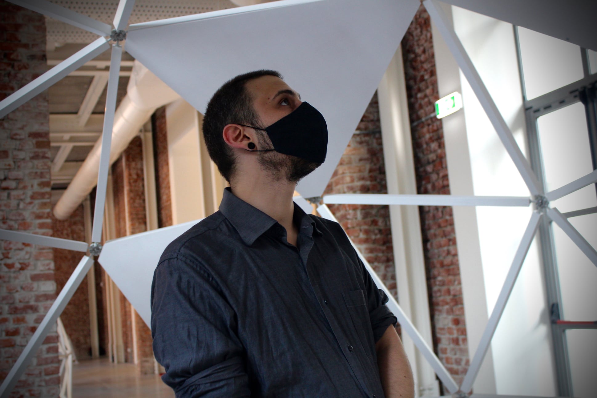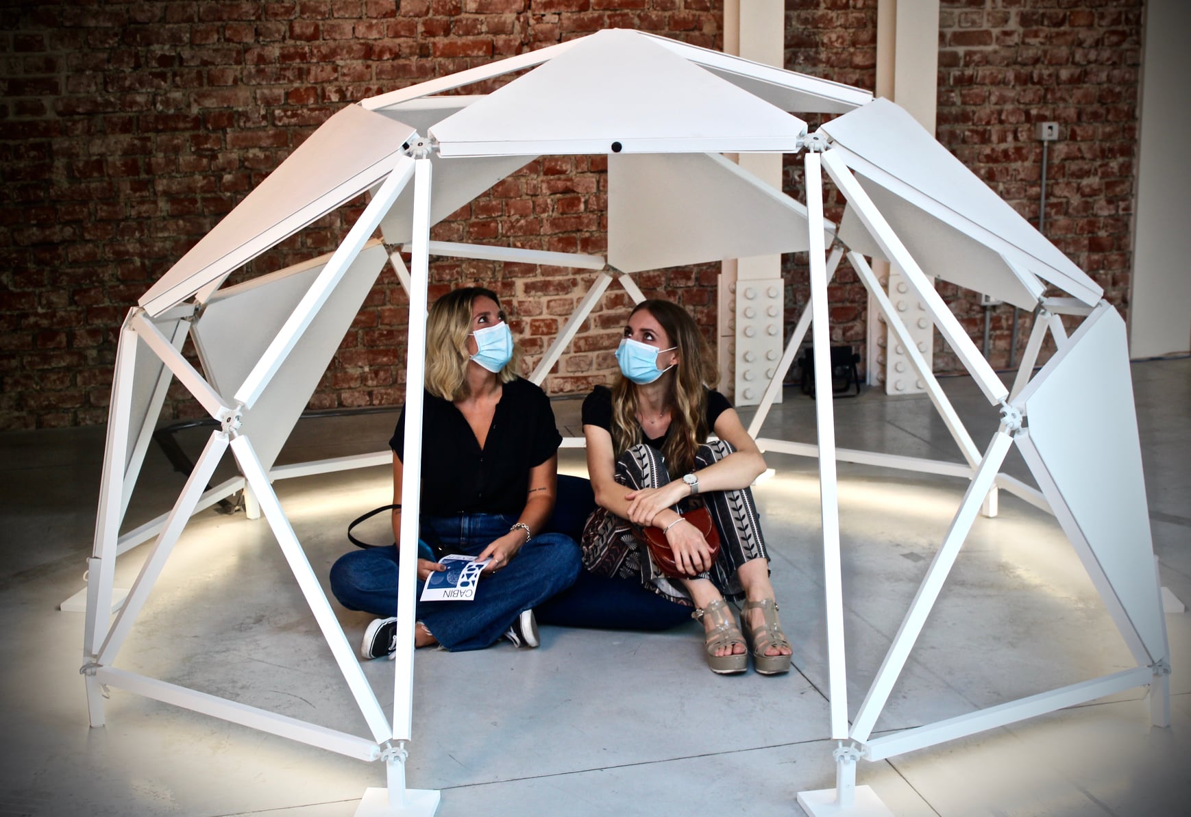 The work consists of three modular geodesic domes that metaphorically trace the three phases of the pandemic; in a process of synthesis and sound dramaturgy, the two artists question the need for a society forced to redesign time and space, establishing new perimeters of safety. The sound spaces equipped with a multi-channel sound system and sensors, which detect the entry of visitors and determine the acousmatic textures and glitches diffused inside the other domes, triggering a process of contagion between the domes and their own inhabitants. Visitors individually join the sound spaces. The entrance and the type of movements of the user determines sound mutations inside their own area of action. Through a specific algorithm, the sensors react to the movements of the users in the two open domes. Over time the domes become more and more "intolerant" to the human presence, so an accumulation process made of glitches, noisy textures, led flickering, are transferred to the third closed dome which filters the process through the low frequencies.