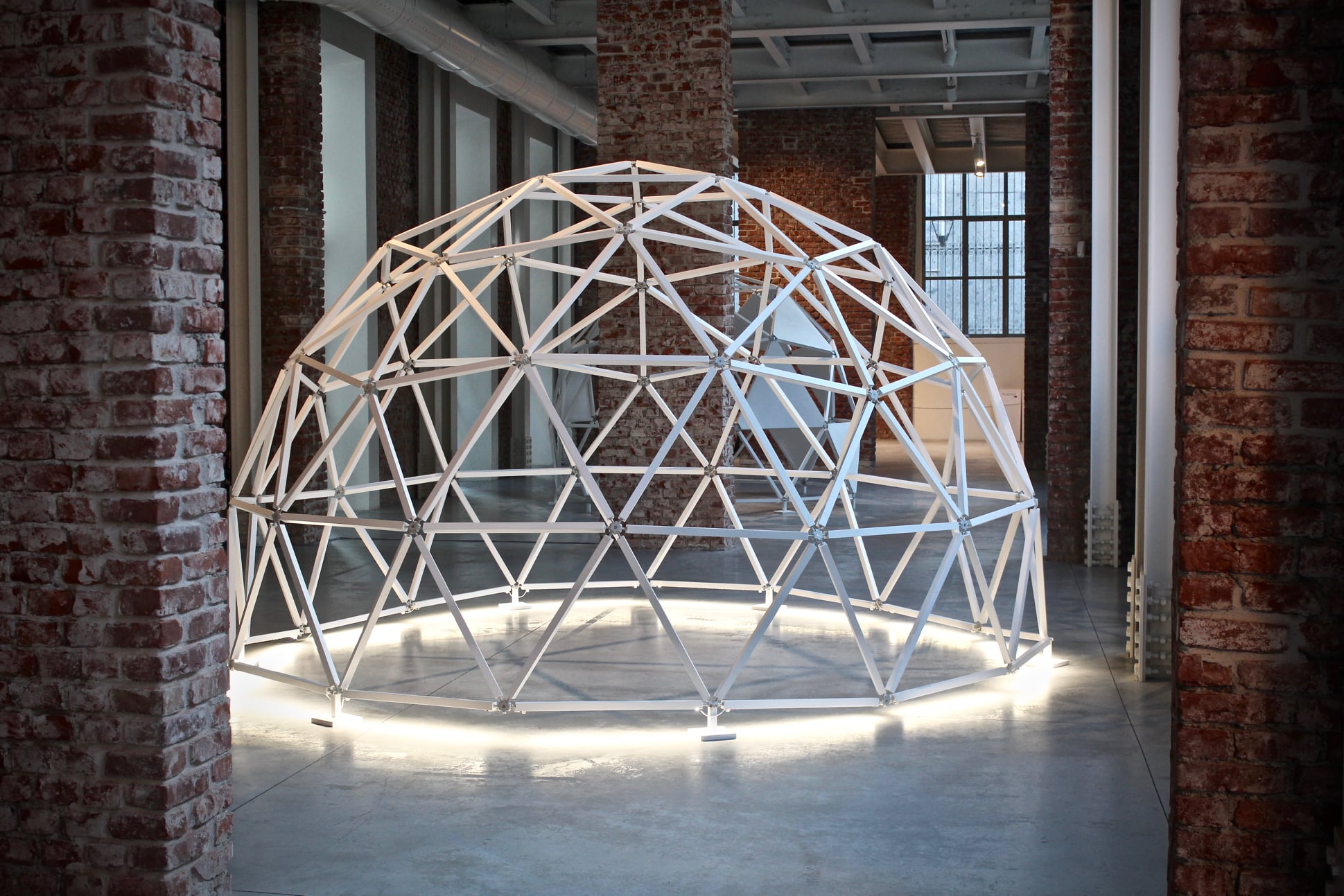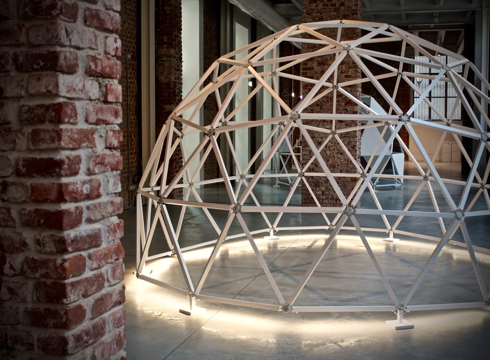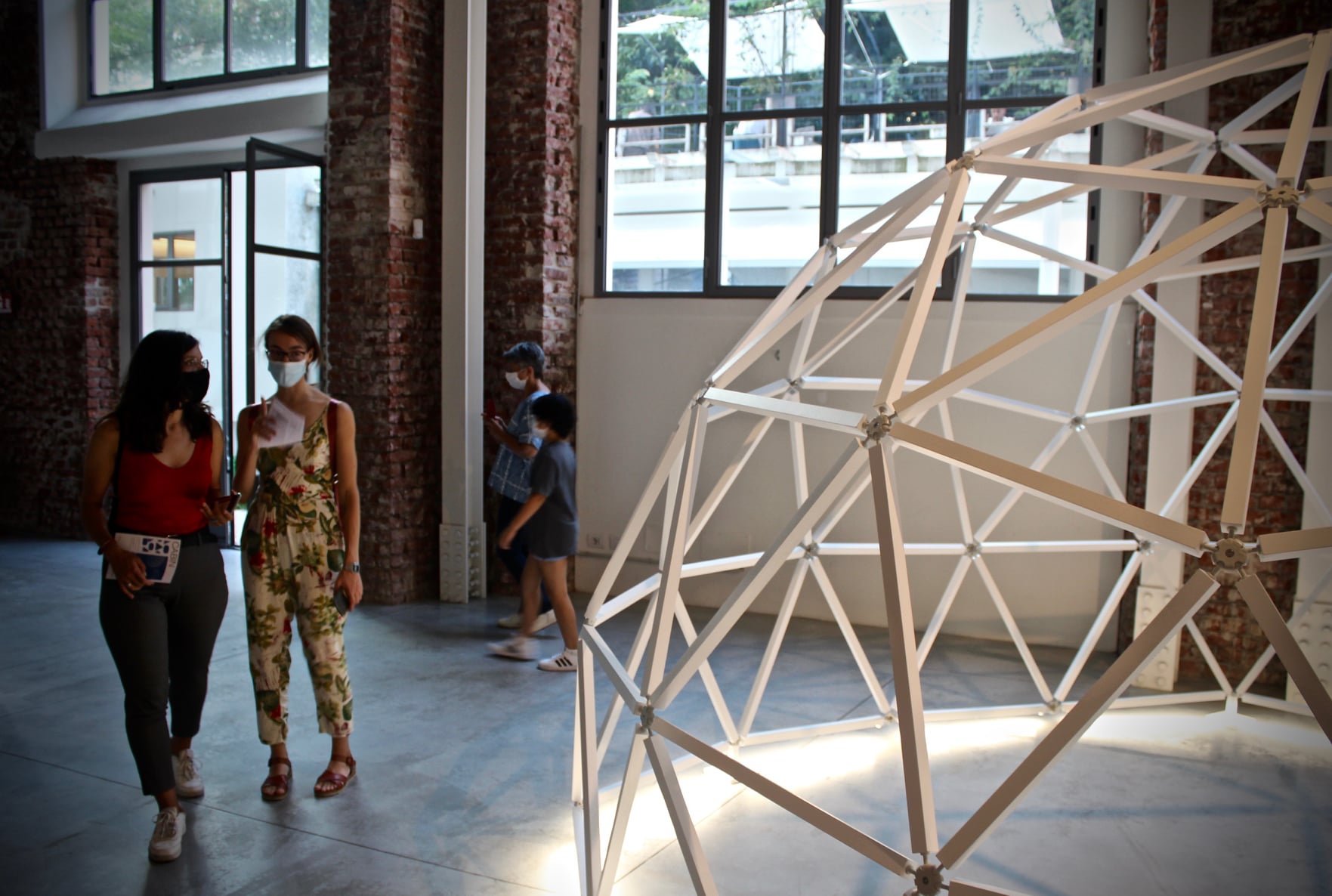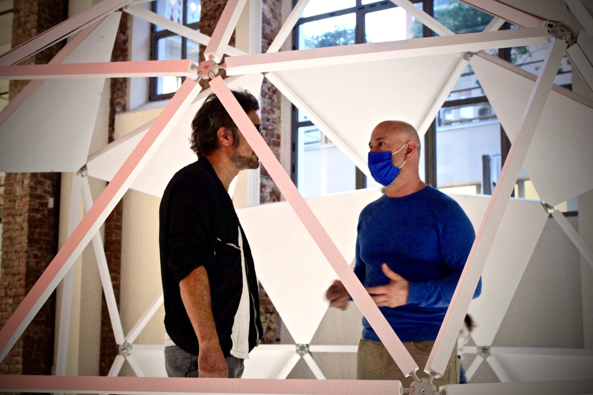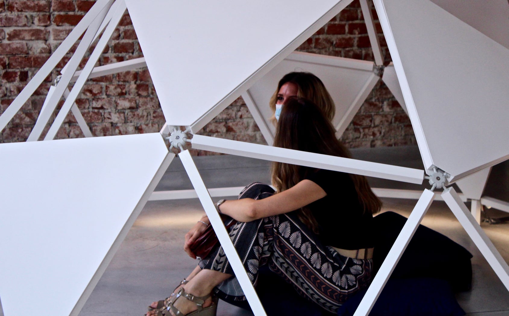 The work consists of three modular geodesic domes that metaphorically trace the three phases of the pandemic; in a process of synthesis and sound dramaturgy, the two artists question the need for a society forced to redesign time and space, establishing new perimeters of safety. The sound spaces equipped with a multi-channel sound system and sensors, which detect the entry of visitors and determine the acousmatic textures and glitches diffused inside the other domes, triggering a process of contagion between the domes and their own inhabitants. Visitors individually join the sound spaces. The entrance and the type of movements of the user determines sound mutations inside their own area of action. Through a specific algorithm, the sensors react to the movements of the users in the two open domes. Over time the domes become more and more "intolerant" to the human presence, so an accumulation process made of glitches, noisy textures, led flickering, are transferred to the third closed dome which filters the process through the low frequencies.